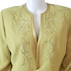 Caramia two-piece bright green crepe skirt suit. Fully lined. Includes a long-sleeve, collarless, open-front jacket with beautiful embroidery and sequins. Matching midi-length straight skirt features a part-elastic waistband, back zipper, and 12.5" back slit. Jacket length 28", sleeve 23", bust 44", shoulder 18". Skirt length 32", waist 30" (unstretched), hip 42". Dry clean. Imported.