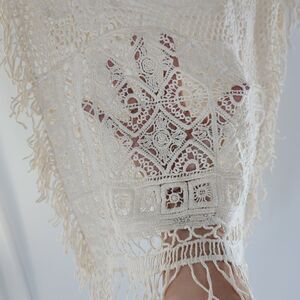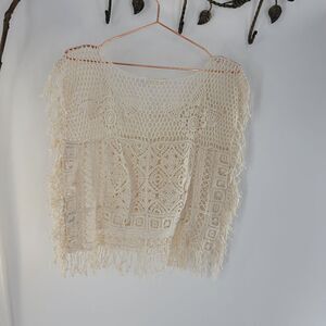 cream colored crochet boxy fit top. one size fits all. best fits small.medium for loose fit. Preloved condition. All sections of interest as well any known flaws have been documented in the photos and noted as thoroughly as possible. if there are no known flaws, none will be noted. Please feel free to ask any questions before purchase 🙂.