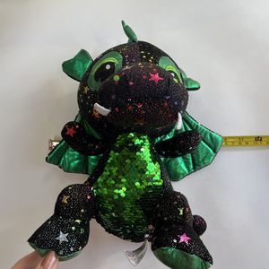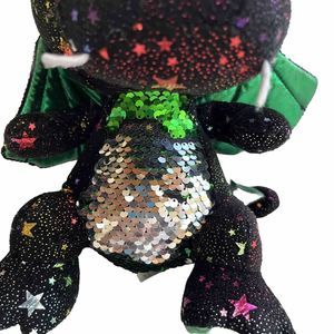 Drogo Dragon II by Caravan Softoys. This guy/gal was made in October of 2019 and measures about 10 inches tall. It is made from black fabric covered with multicolored metallic looking stars and specks (like stardust). Its accent features are an emerald green. There are green sequins on the belly area that can be flipped and changed to silver. There are some signs of wear on the green fabric, particularly the feet, spikes and ears (see pictures).