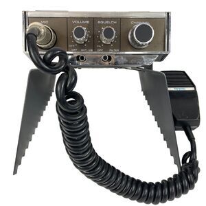 This transceiver is untested! In good cosmetic condition, but I have no way to test it. At this age, it may be a collector's item. It is black with silver accents, and has a tilted attachment for mounting. The button on the communication piece presses smoothly.