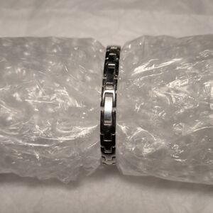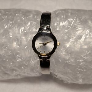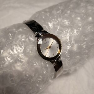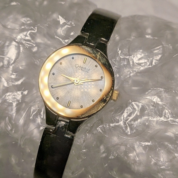 Vintage two toned Caravelle by Bulova watch. There's a gold ring around the dial while the rest of the band is silver. It has a silver face as well. Made of stainless steel. 20 mm. It will need a new battery.