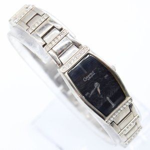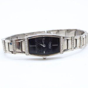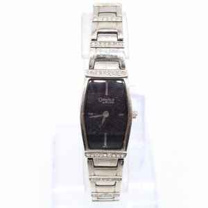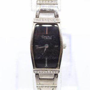 Caravelle By Bulova Watch Womens Silver Tone Rhinestones Black Rectangular Dial