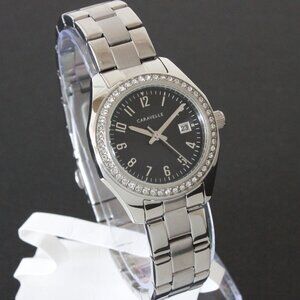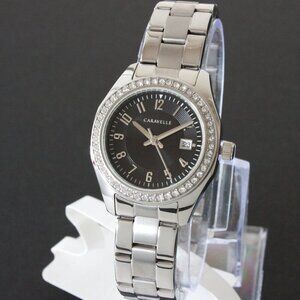 Caravelle Ladies Dress Watch By Bulova Black Sunray Dial 48 Crystal Bezel 28mm