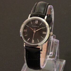 This ladies' Caravelle by Bulova watch features a black dial with silver-toned hands and Roman numeral markers, a textured quadrant design and mineral crystal in a 28.0mm stainless steel case. The reliable Japanese quartz movement ensures accurate time keeping. The black leather strap, with a crocodile pattern, secures with a buckle clasp. Water-resistant to 30 meters