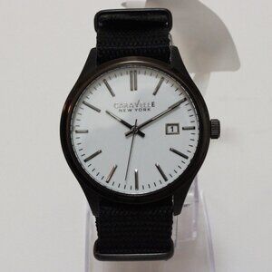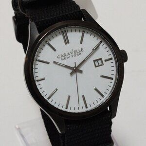 Stay on point and up to the minute with this retro men's field watch by Caravelle. It has a black stainless case on a black military style strap with a Japanese quartz movement that offers grab and go convenience by Bulova. This watch is new in box and functions as it should.