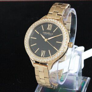 Caravelle New York Ladies Casual Watch Swarovski Crystal Bezel Gold Tone 37mm