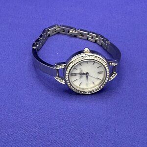 Caravelle New York by Bulova ladies’ analog silver-tone watch with clear crystal accents. Model 43L166. Water resistant. Watch runs. Fresh battery. Slight scratches on crystal. Otherwise, in good pre-owned condition. Watch measures 7” “end to end”. Wrist size 6 ½”, with fold-over clasp.