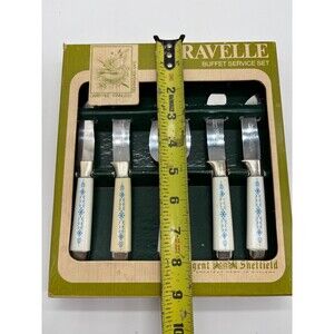 Add a touch of mid-century elegance to your dining table with this Vintage Caravelle Regent Sheffield 5-Piece Buffet Set featuring the iconic Blue Snowflake Starburst pattern. Crafted from high-quality stainless steel with blue enamel handles, this set showcases timeless retro charm and Sheffield craftsmanship.