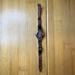 Excellent condition! Runs perfectly with a brand new battery. Minimal cosmetic wear. This model has a silver stainless steel bracelet with some normal links and some longer bangle-style links, and a stainless steel round case. It has a light gold bezel and a silver dial with minimalist gold accents. Box not included