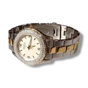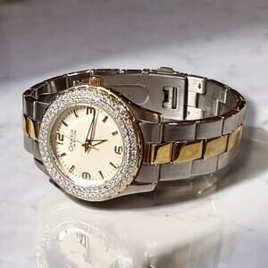 Caravelle by Bulova Watch Womens Two Tone Stainless Rhinestone Bezel Quartz RUNS