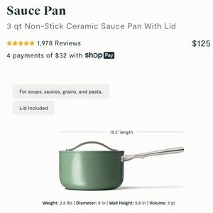 Caraway’s 3 qt Non-Stick Ceramic Sauce Pan With Lid— NEVER USED