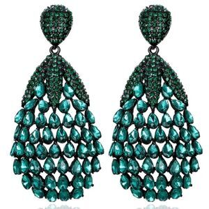 Carbon Black Tone Banquet Teardrop Art Deco Vintage Inspired Dangling Drop Post Back Chandelier Statement Earrings Embellished with Teardrop and Round Cut Emerald Green Austrian Crystals