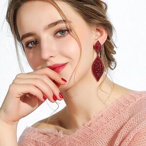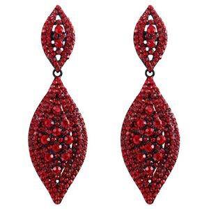 Carbon Black Tone Double Leaf Art Deco Vintage Style Dangling Drop Post Back Chandelier Statement Earrings Embellished with Round Cut Ruby Red Crystals