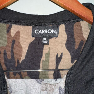 This is a pre-owned Carbon brand, size XL, long-sleeved shirt with a camouflage pattern in shades of green, brown, and black. It features a black hooded sweatshirt-style hood and a button-down front with black buttons. The shirt has a single chest pocket on the left side. The material appears to be a soft, possibly flannel-like fabric. There are no immediately visible stains or tears.