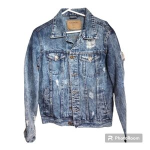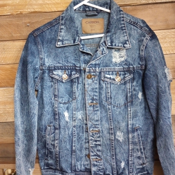 Carbon Distressed Ripped Acid Wash Blue Denim Jean Jacket Women's Unisex Small. Approximate measurements are laying flat armpit to armpit 19" and length from shoulder to hem 25". Condition is pre owned, used, good condition.