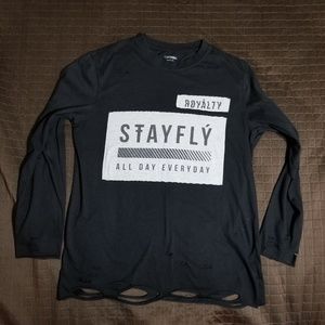 Carbon long sleeve tee. Distressed throughout , torn tattered style on hem, shirt, sleeve. super stylish. No flaws. Size Medium