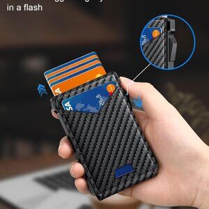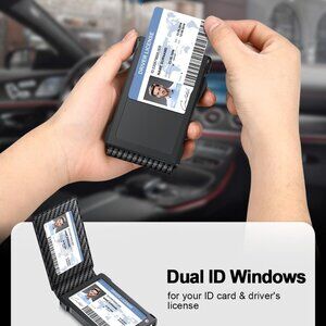 Features: Ultra-slim bi-fold wallet made from durable 6063 space-grade aluminum and sleek carbon fiber. Features a smooth pop-up card mechanism, double ID windows for quick access, and a generous number of compartments and pockets for cards, cash, and bills. Magnetic closure keeps everything secure without bulk.
