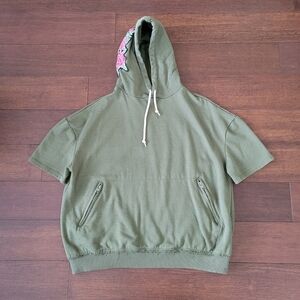 Carbon Women's Army Green Floral Embroidered Short Sleeve Pullover Hoodie Size M