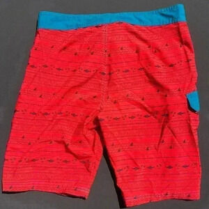 Carbon board shorts. Red and blue. Sharks and bone pattern.