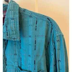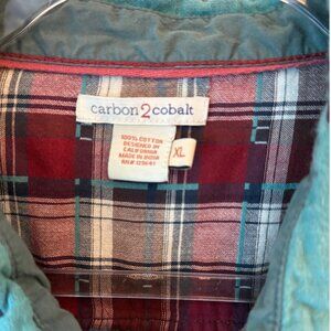 Soft, stylish, and distinctively Carbon2Cobalt 💙 This men’s XL button-front shirt comes in a unique teal blue with subtle woven texture and plaid interior trim. Made from 100% cotton with a comfortable, relaxed fit.
