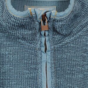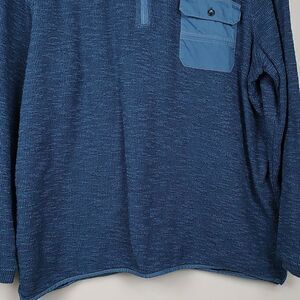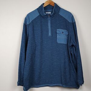 Carbon2Colbalt Quarter Zip Men's Long Sleeve Cotton Pullover Sweater. Left chest snap flap pocket with detailing at the shoulders and a copper zipper pull. 82% cotton and 18% polyester. Size XL.