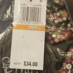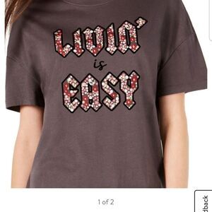 Graphic on shirt says Livin is Easy, short is gray, graphics multi-colored flowers.