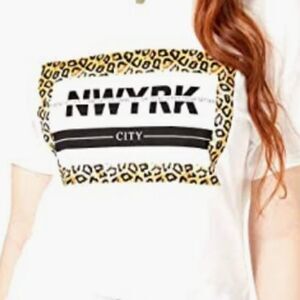 Crew neck, shirt sleeve with leopard pattern and graphic wording reading NWYRK