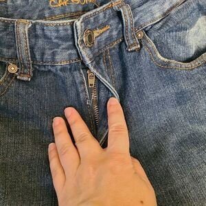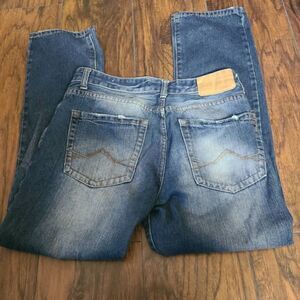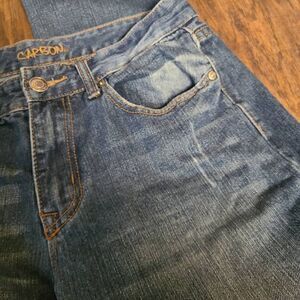 This is a pair of blue denim jeans by Carbon. They are low rise slim straight and have distressed details as shown in the photos.