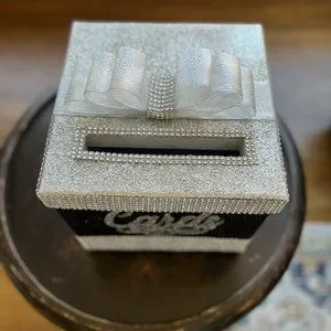 Black and silver glitter card box with silver bow. Perfect for guests to drop gift cards into at a wedding or birthday party. Holds many different sized cards. Condition is like New!! Used once for Sweet 16 party.