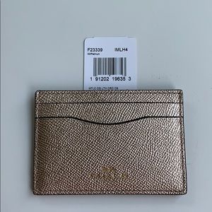 A shimmery card case that is platinum in color by Coach. NWT