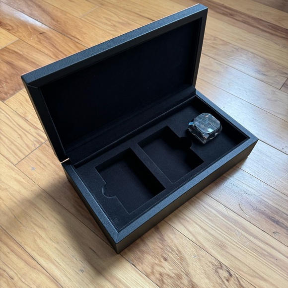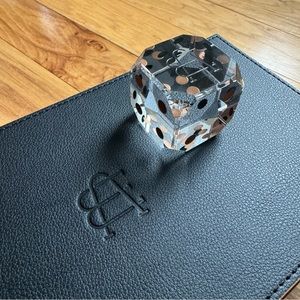 Leather card game case. Holds two sets of standard playing cards. Glass dice paperweight. Black with brown trim.