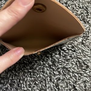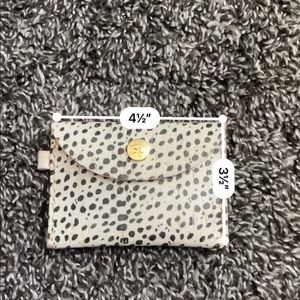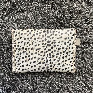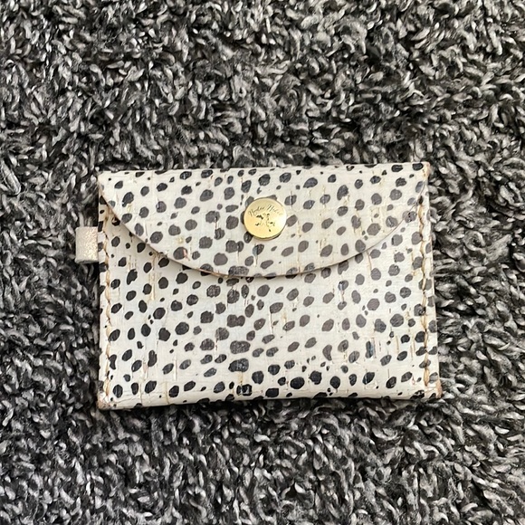 Black and white cheetah print card holder, with flap closure with gold button. Could add key ring . Made of cork like material