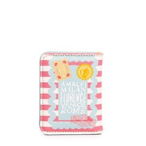 Vibrant wallet with travel-themed designs. Features red, yellow, and blue accents.