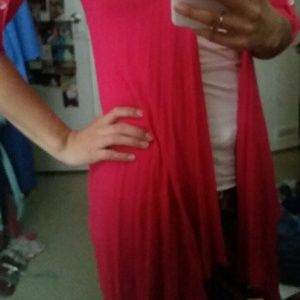 Pink cardigan. I only wore couple of times. It has a white lace cross design on back of it. No stains. In great condition.
