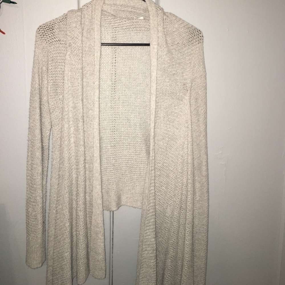 Grey cardigan long on sides shorter in back. The size is xl but it runs very small and it's tight on the sleeves so it could fit someone who is a size small. Worn once