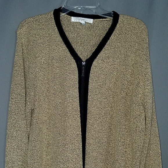 Tan with black trim. V neck, zipper front