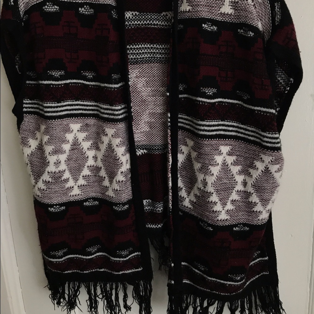 JCPenny cardigan. Maroon white and black. Tribal with fringe.