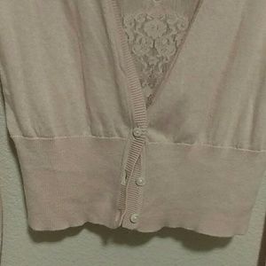 Soft pink sweater, lace detail on the back, 3 button closure on bottom. No tags but I never wore it. No holes, no lose threads or buttons.