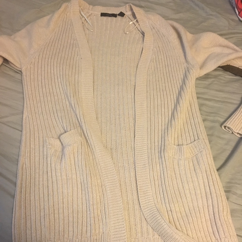 Cute warm cardigan. Off white color with tan pieces on elbow. Warm and never been worn.
