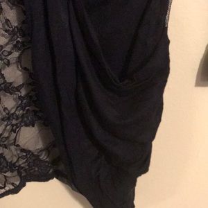 This cardigan has sleeves that are 3/4 length. The back is blue flower lace and see through. The front has two pockets. Made in Cambodia.