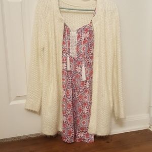 It's an off white soft and warm knitted cardigan. Perfect with dresses or jeans and leggings.