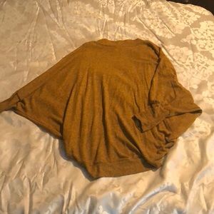 Very soft and worn once. Very lose fir but sleeves fit snug so it will not fall off of your shoulders. Mustard yellow and black.