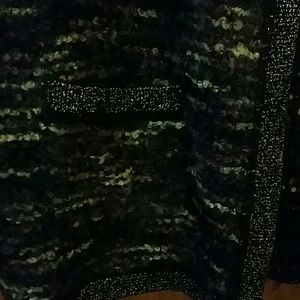 Machine washable knitted material with glittery trimmings. 2 front pockets 21 in length.
