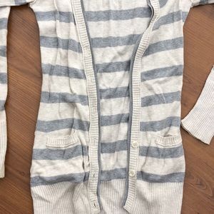 Missing some buttons but is an easy fix or you can just wear it open. Oatmeal/grey and striped and so soft. Plus there’s pockets!