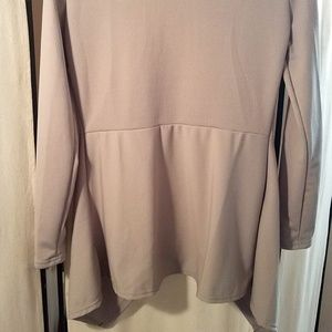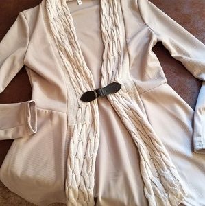 Lightweight sweater cardigan, light grey, with black faux leather decorative buckle.