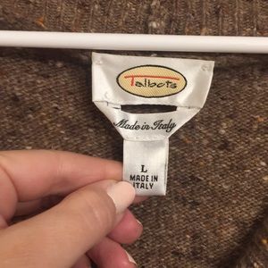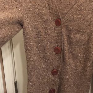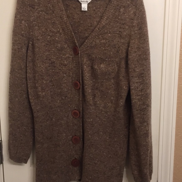 Super cute brown wool cardigan. Love the big brown buttons. Like new. The tag says dry clean but I have washed it with wool lite on hand wash cycle and lay to dry cane out fine. 😊