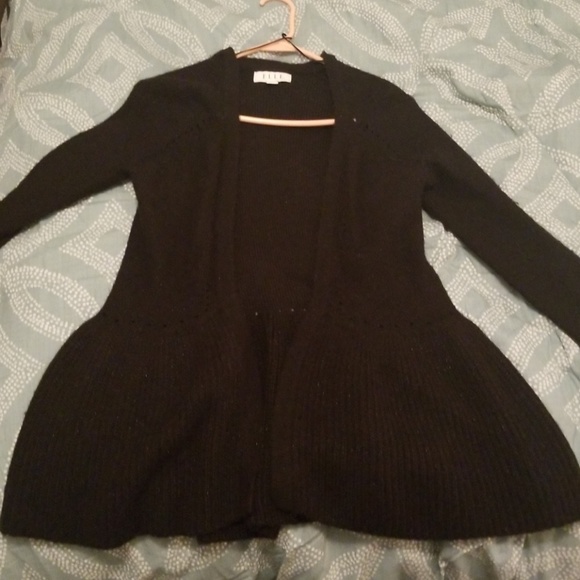 Black with silver sparkle cardigan. Form fitting with a flare at the hip. One of my favorites to pair with any outfit.