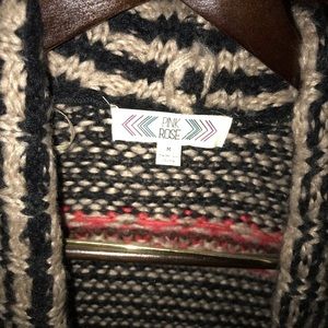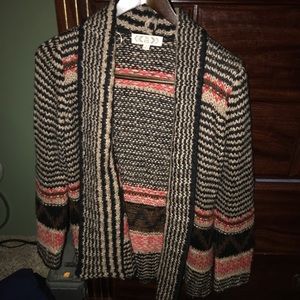 Hardly worn, very nice and warm cardigan. Has a coral color included with black, tan and browns