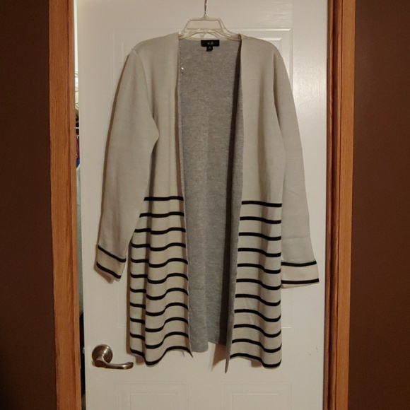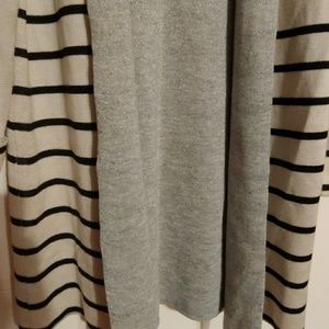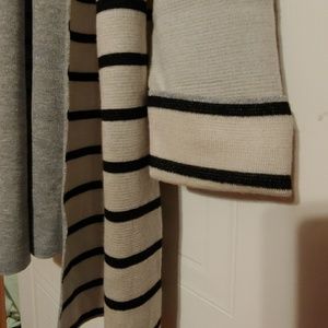 Long sleeved cardigan. Cream colored with black stripes and gray inside.