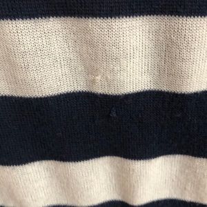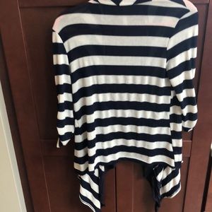 Navy blue and white striped cardigan. Lightly worn but cleaned! Sleeved can be buttoned up or taken down. Cotton materials. Drapes low in the from and goes regular length in the back with open front. Size can vary because it is open. Very small pull in the back not noticeable unless looking for it